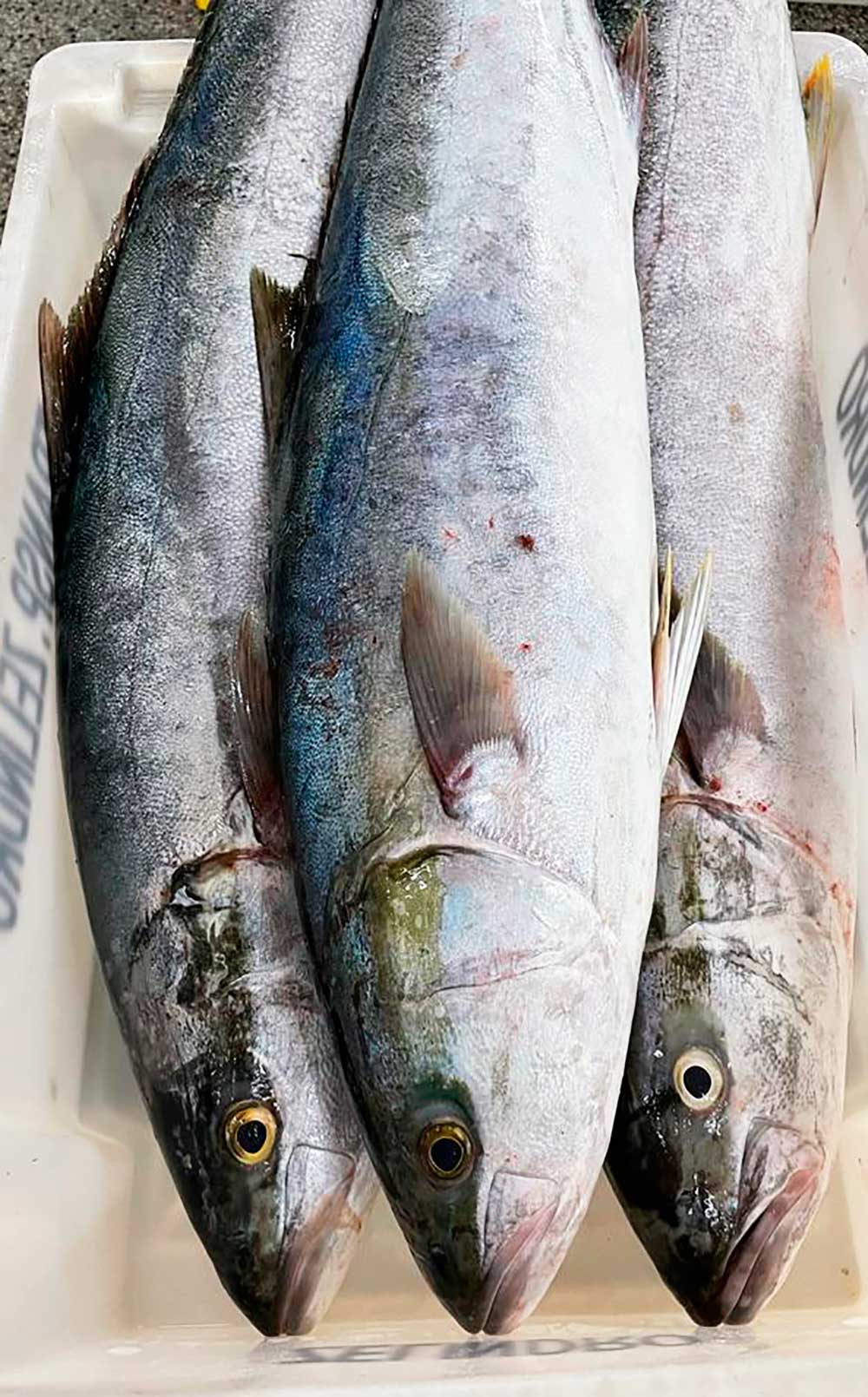 The hamachi has light golden flesh and may display a dark streak along the edge of a fillet, a characteristic of the two-toned musculature of fish that cruise the open seas.